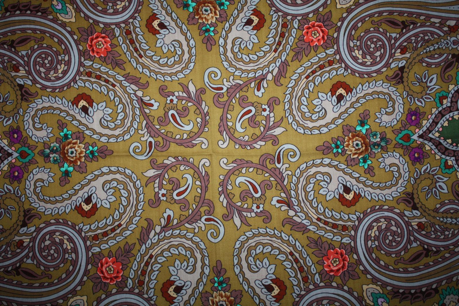 Есть одно старое фото, но у меня Сказка не современной печати - медальоны не мятные, а нежной травяной зелени, серединка оливковая, а не горчичная, поэтому фото не показательное, но впечатление составить можно (Кликните, чтобы почитать, что спрятано под катом)...Юннки писал(а):Хотелось бы сравнить оливковую Сказку 18 с Карнавалом 17.Может быть у кого-то есть обе эти шали?