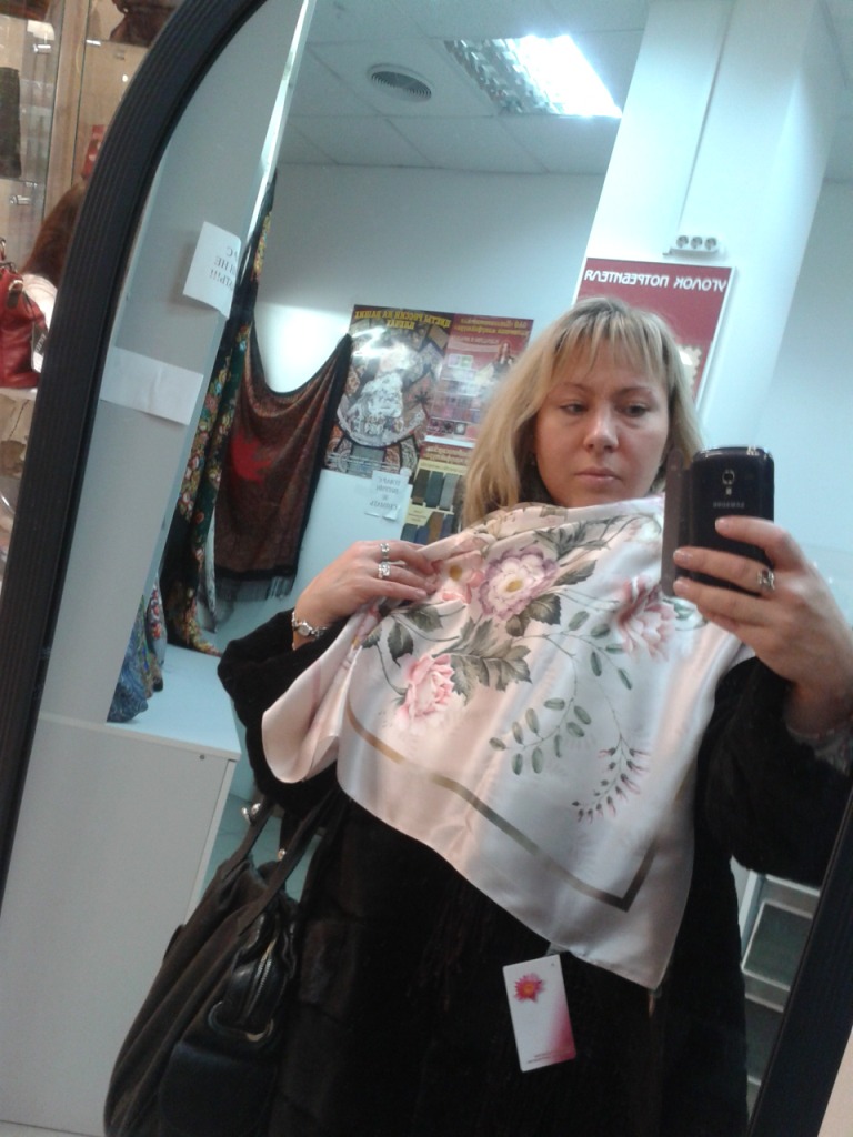 Я прошу прощения за качество фото. Просто хотелось поделиться такой красотой (не себя имею в виду - только шикарный, нежный платочек - шелковый Лунный сад, кремовый!).