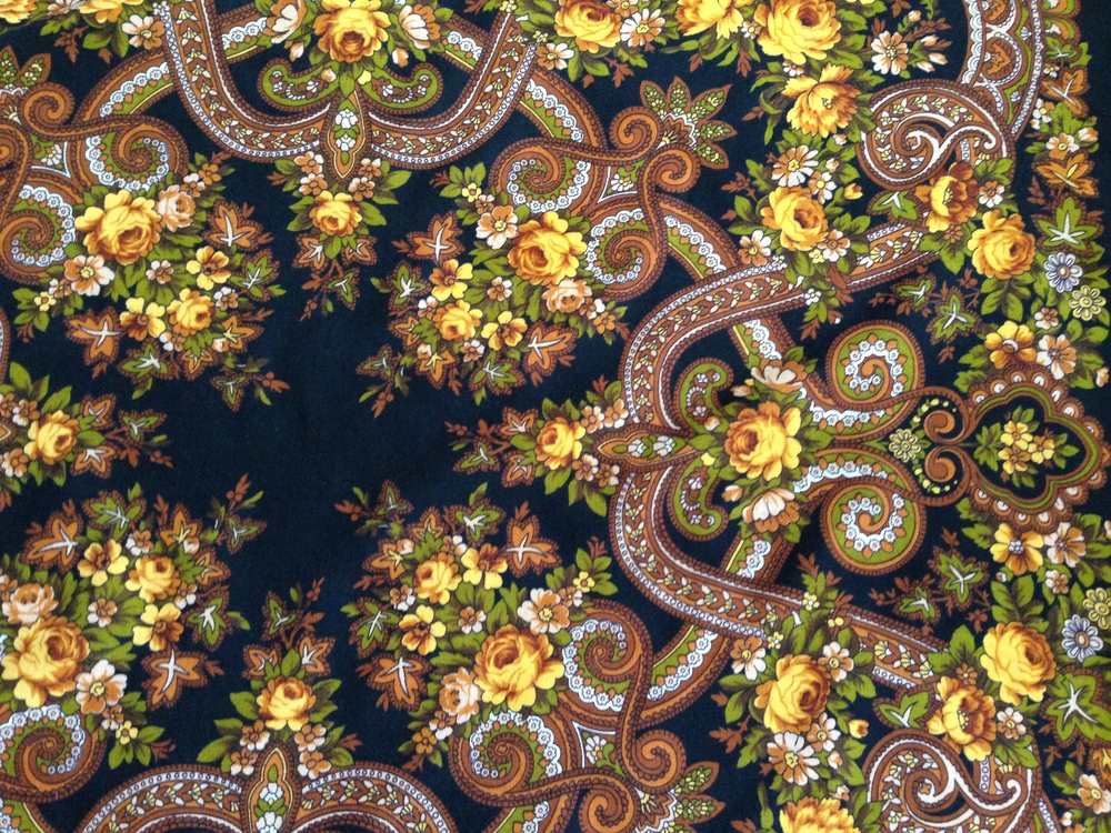 Купила Рыжее - рыжее лето в субботу. В уме всегда держала эту серединку. Можно свернуть широким рыжим шарфом - внизу окажется чудесная цветочная кайма на спокойном тёмно - красном фоне. Буду носить с бежевым плащем и замшевыми ботильонами с вырезанными носиками :) Охра и бордо с болотной гаммой хороши - цвета загогулинок и осоки в рисунке ^%