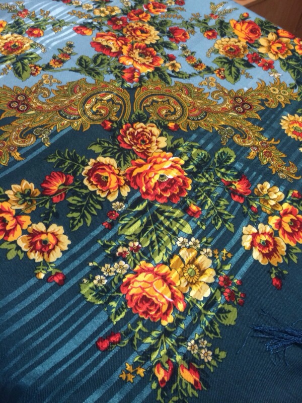 а я получила свои "цветы под снегом", (Кликните, чтобы почитать, что спрятано под катом).... Что сказать... ткань приятная, но что синтетика - совершенно точно, цвета прекрасные, но размер 120 х 120 простора воображению не дает. Кисточки негустые, но симпатичные, но сам платок обработан оверлоком и очень плохо обработан :( Купила только из-за цвета и чудесного рисунка, а колорит моих цветов очень даже симпатичный и к названию вполне идет :)