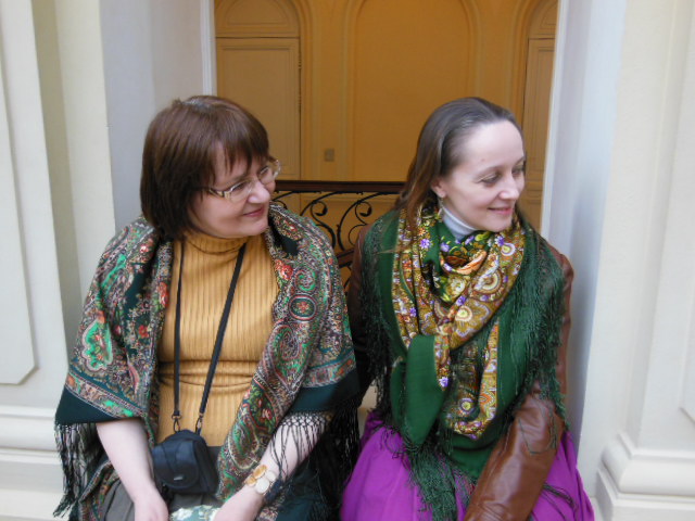 Это фото немного пестровато, но пусть тоже будет. Уж очень хороши и шали и хозяйки.