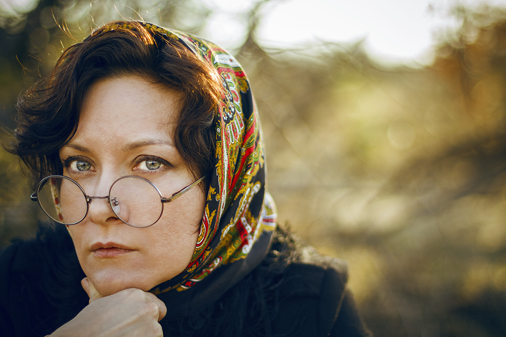 Лицо крупным планом красиво,но очки...как-то не отсюда.Композиция-!!! и пейзаж плывет живописно.