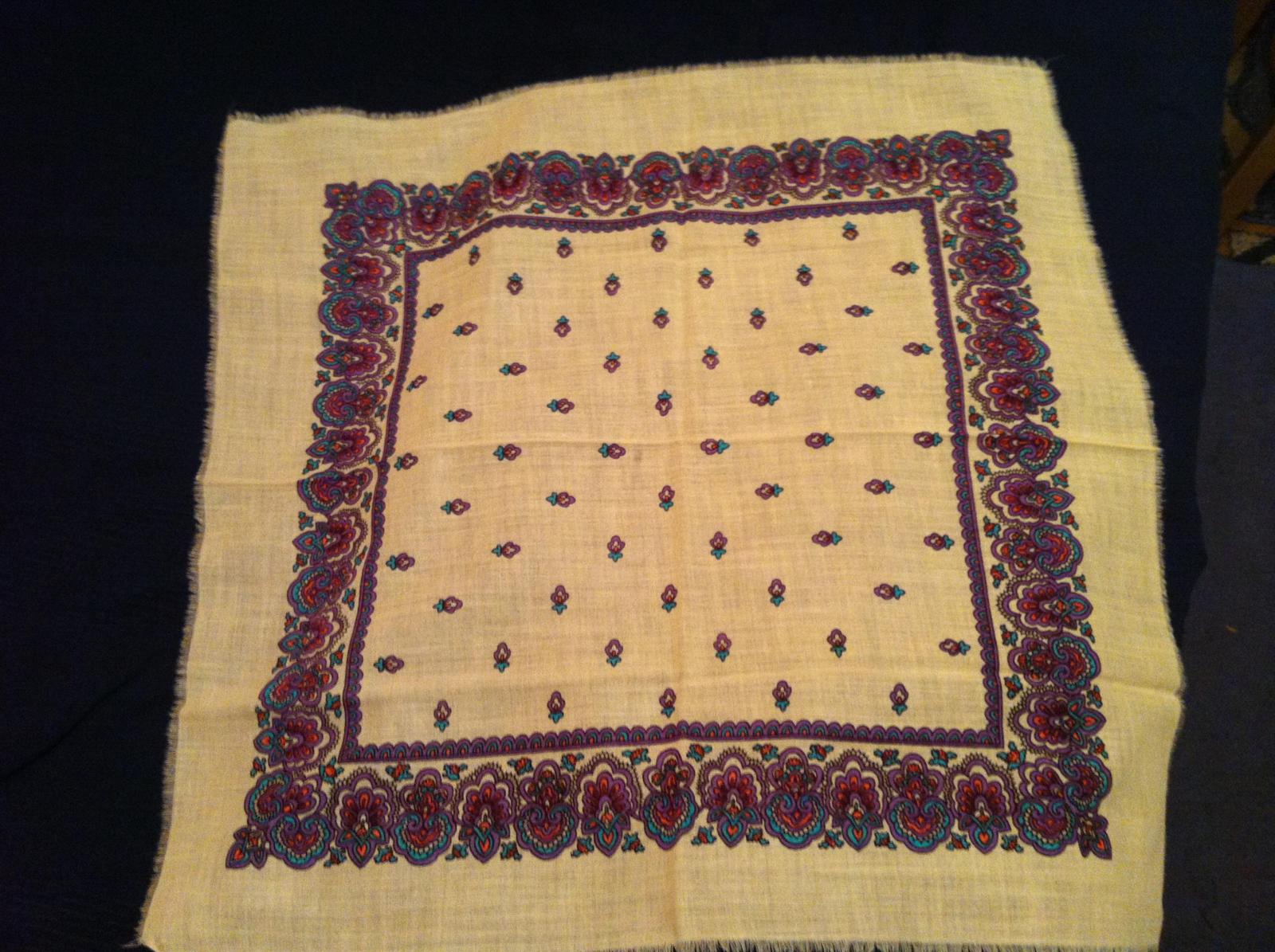 Платочек шерстяной 82х82 с орнаментом "Paisley" - классический восточный орнамент из элементов каплеобразной формы, имеющих разнообразные названия: индийский огурец, восточный огурец, турецкий боб, пейсли или бута (миндалевидный элемент с заострённым загнутым верхним концом) - в рамке