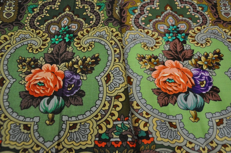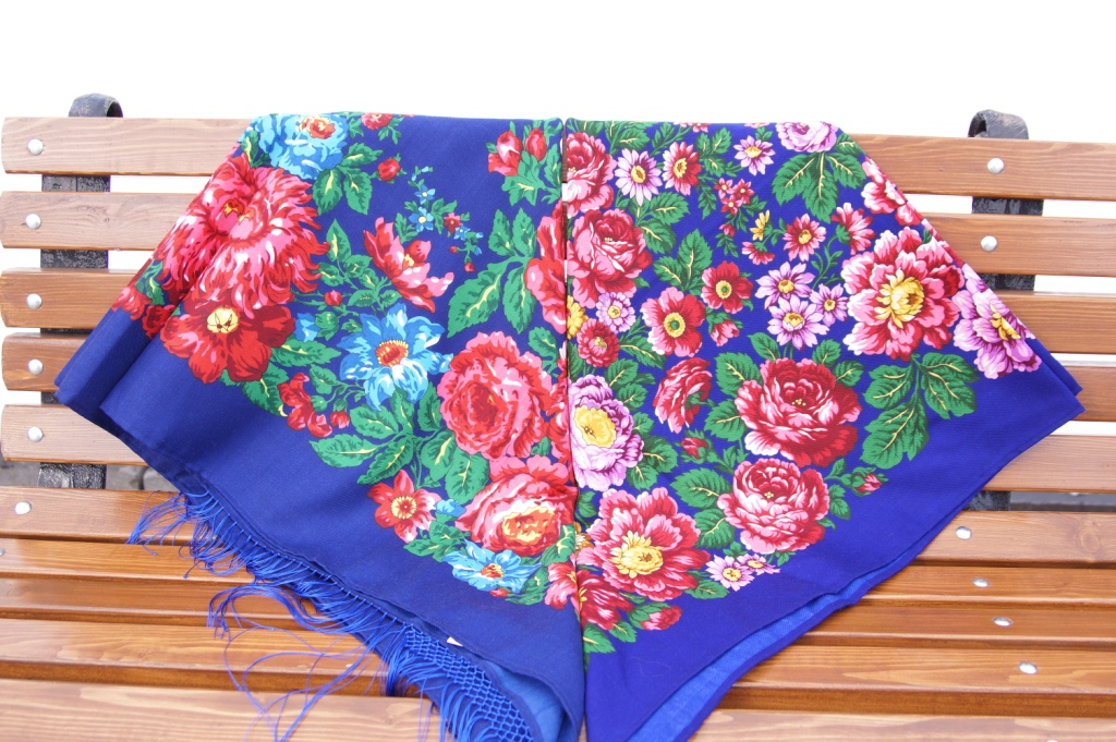 Розы и пионы-13, Переполох-13.На фото не видно, но грунт платков отличается Розы и пионы более сине-голубые, а Переполох сине-фиолетовый.