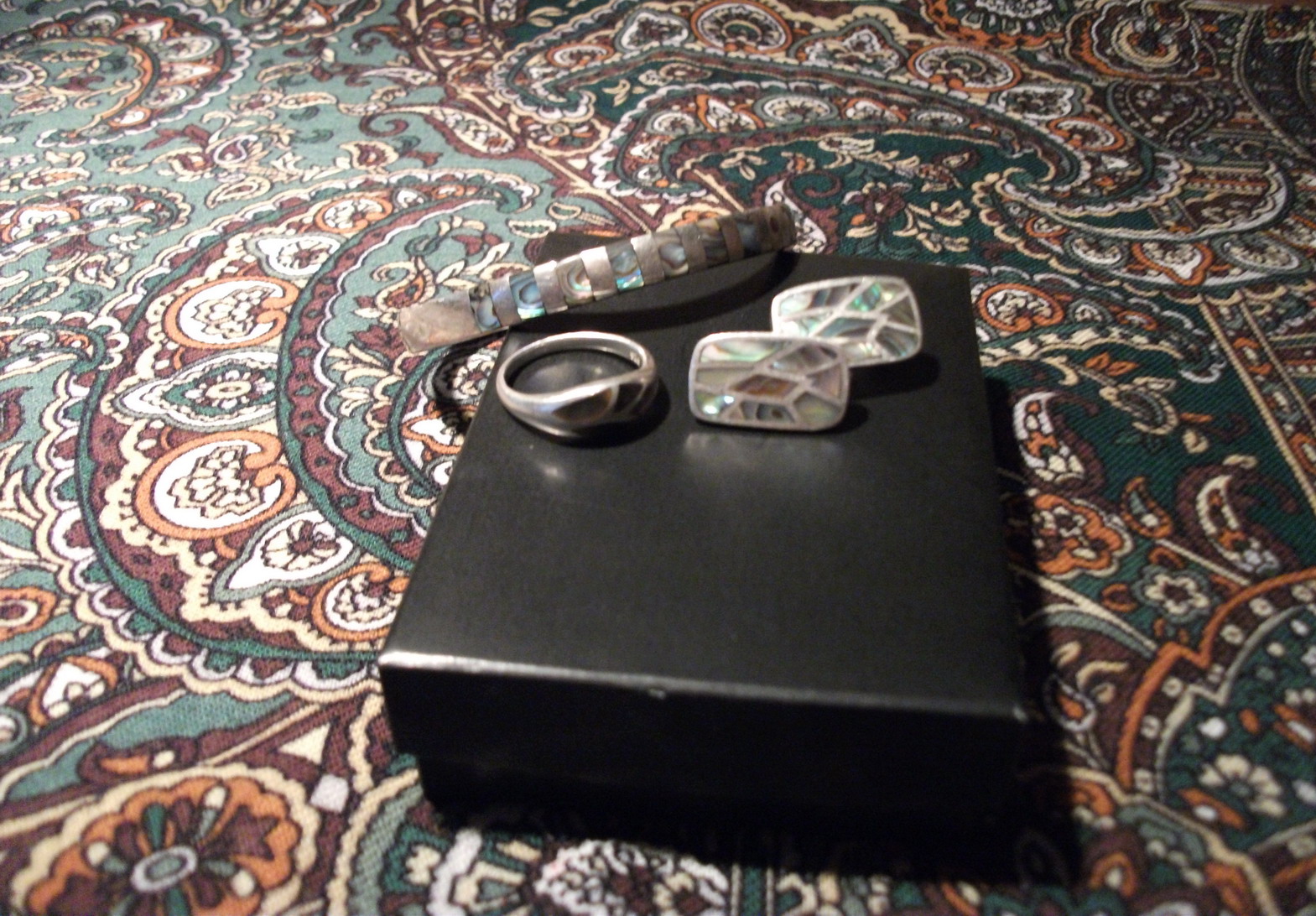 Попыталась сфотографировать свой любимый гелиотис (халиотис). Задача практически невозможная - перламутровый блеск украшений сильно бликует от вспышки, но очень хочется показать Вам прелесть сочетания украшений с платком "Садко". У меня от этого союза платка с гелиотисом рождаются ассоциации с богатством подводного сказочного царства. Серьги, колечко и браслет - гелиотис в серебре.