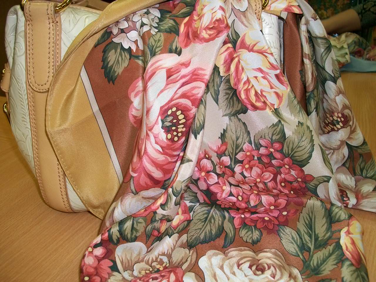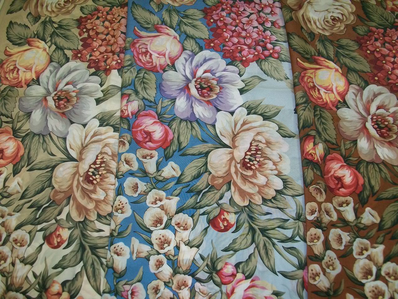 "Чайных роз" три колорита замечены (голубой точно есть, бежево-горчичный...и ещё какой-то - завтра, возможно, сделаем фото). Только, я сирени на платке не заметила - заполненный рисунок, плотный, "густой", но взгляд задержался на гортензии (или это, всё-таки ,сирень? такая крупная? - но "кистью" похожая на гортензию
