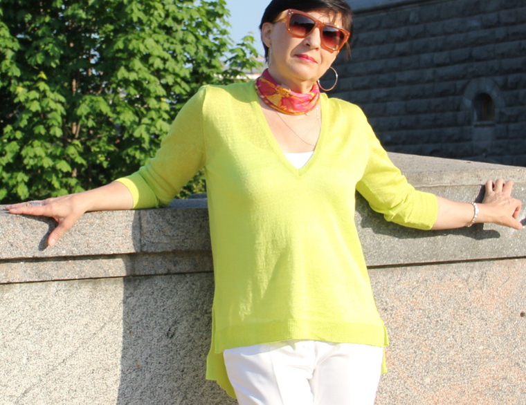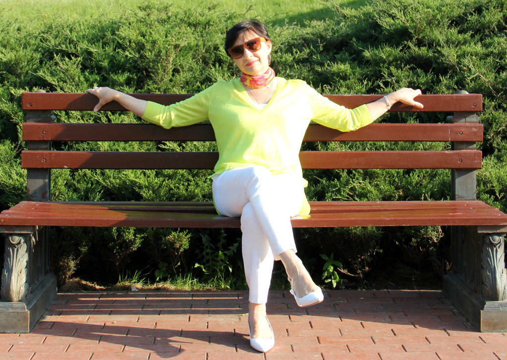 А я не так эффетно - крошечный платочек на шее, но радости полные (белые) штаны, тсз. :) В лучах заходящего солнца...