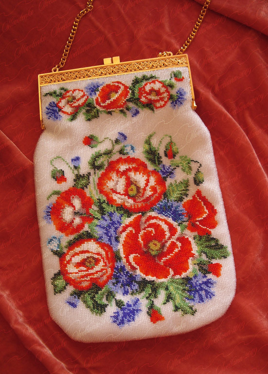 Запущу немного своих маков в общую песочницу. Это вышивка бисером, самым мелким 15-м и 16-м номером по канве Aida-18 (если вышивать привычным размером и на Aida-14, сумочка величиной с рюкзак получится, а это нежелательно). Жаль, палитра у бисера не очень богатая,- как в красках, цвет не намешаешь. Поэтому контраст у васильков чрезмерный. Вышивать две одинаковые стороны было неинтересно, на обороте сделала букет поспокойнее. Только сумочка у меня не задержалась, сейчас радует другого владельца.
