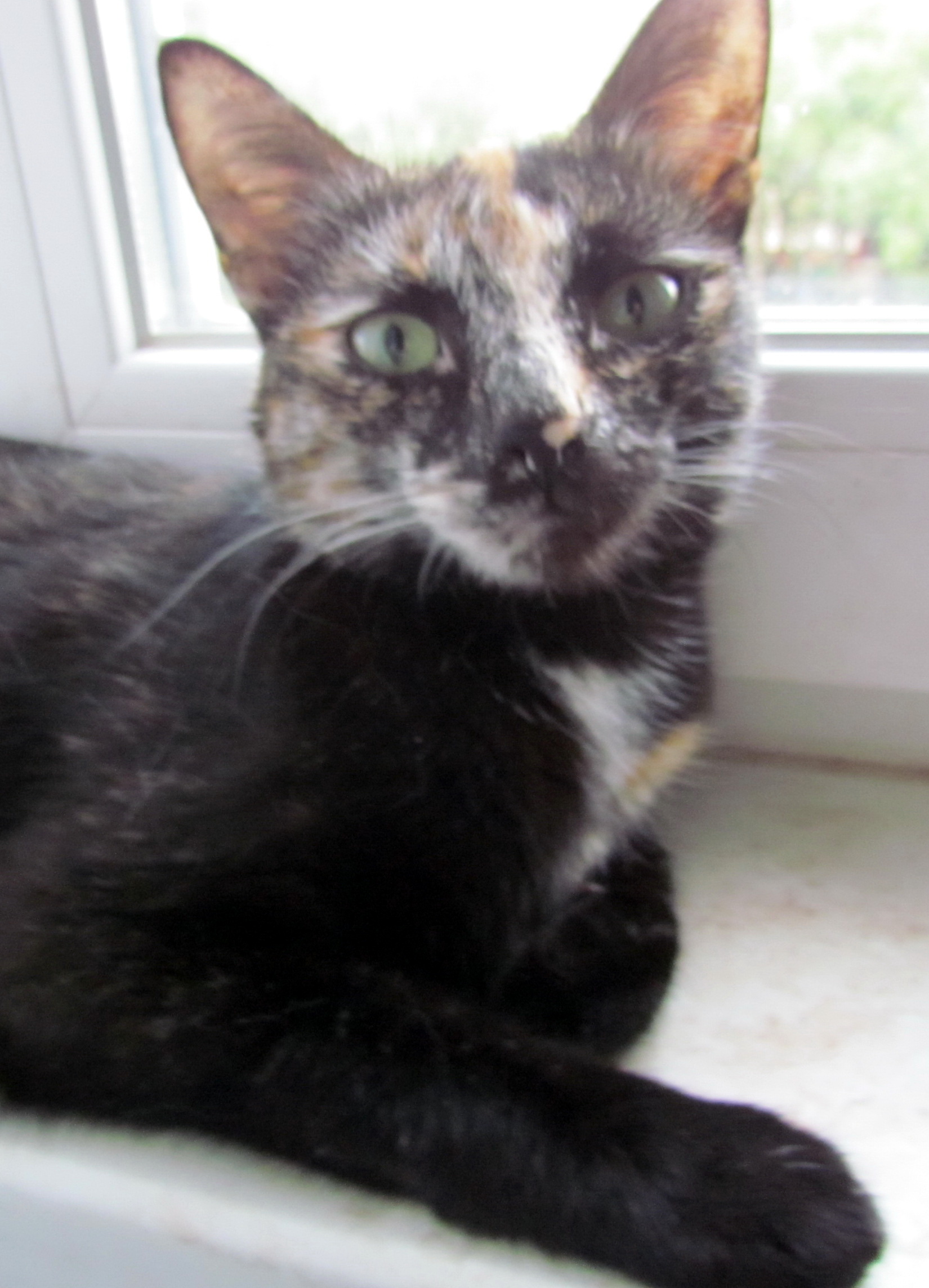 Милая девочка с отломанным клыком и брызгами солнца на темной шкурке (такой окрас называется "звездное небо" - у черных черепах, такие котята ценятся). Уж что с ней случилось остается только гадать. Спала на почте свернувшись клубком около трубы. Я, как вы наверное догадались, пришла за очередной платочной посылкой. Когда я ее подняла под животик, животика и никакого не прощупывалось: легкая как пушинка, она неизвестно когда ела в последний раз