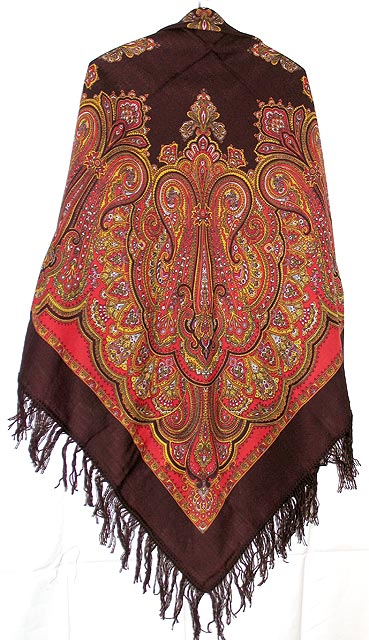 Мне по фото на platki.ru очень нравился черно-красный вариант, но, увидев его наяву, не купила: мне мешал зеленый цвет в узоре. Очень я горевала, любуясь фотографией на сайте: и чего вместо зеленого не черный или хоть темно-бордовый?.. И вот, будучи прошлой весной в Беларуси, я увидела там - в магазине сувениров, среди прочих павлопосадских платков - практически то, о чем мечтала. Кайма, правда, была не черная, а темно-темно-бордовая. Настолько темная, что впечатление было, будто на сайте фото именно этой шали. А вместо зеленого на ней хаки оказался, как у расцветки с темно-красной каймой. Вот такой я сувенир привезла из Беларуси