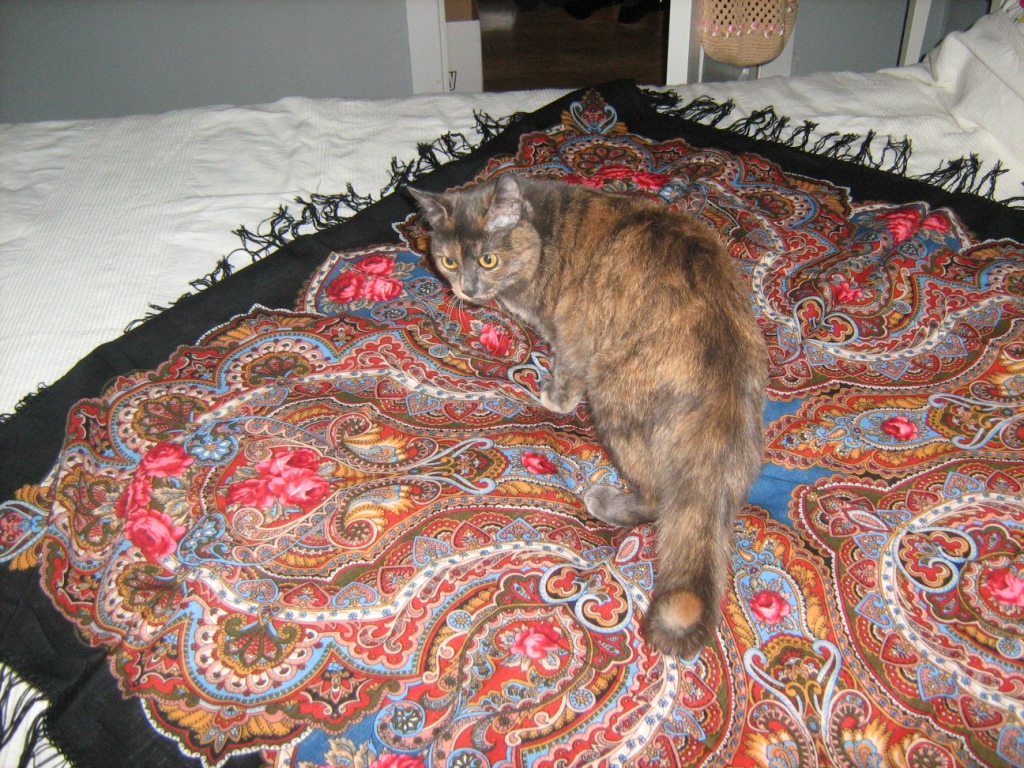 А под Цветы под снегом сам забрался. Пробовала забрать шаль, безуспешно,чуть не укусил. Пришлось отвлекать его сухарями-бусинками (т.е. сухим кормом).
