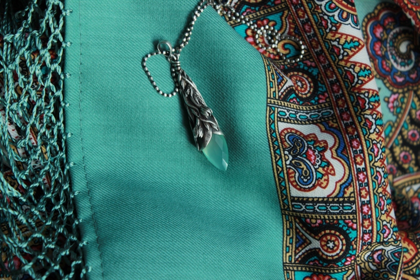 Этот кулон я покупала у той же девушки, но тогда мы еще не были знакомы. Серебряная глина, халцедон. (Камень сам по себе - мятно-зеленый, но на бирюзовом ВУ-3 смотрится практически голубым :) )