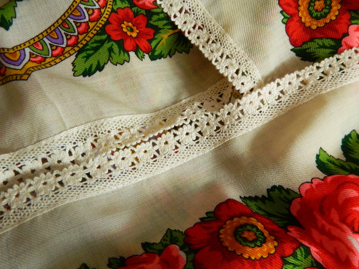 Платок покупала на форуме,он был с самоделешной бахромой. Бахрома была замечательная,но совсем не подходила по цвету. Убрала её,заодно половину каймы срезала,захотелось её уменьшить.