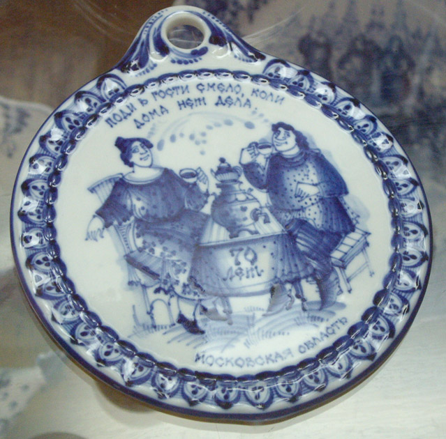 Холодная гамма Гжели хорошо сочетается с теплым цветом и фактурой дерева. Основная тема здесь - пословицы.