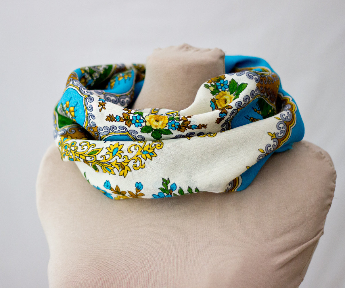 Мне кажется, что платок "Золотое кольцо России" очень стильно смотрится в намотке. Если бы я носила эту цветовую гамму, то он у меня был бы востребован. И он вообще очень красив. Добавлю пару фотографий, не так много их на форуме, кажется.
