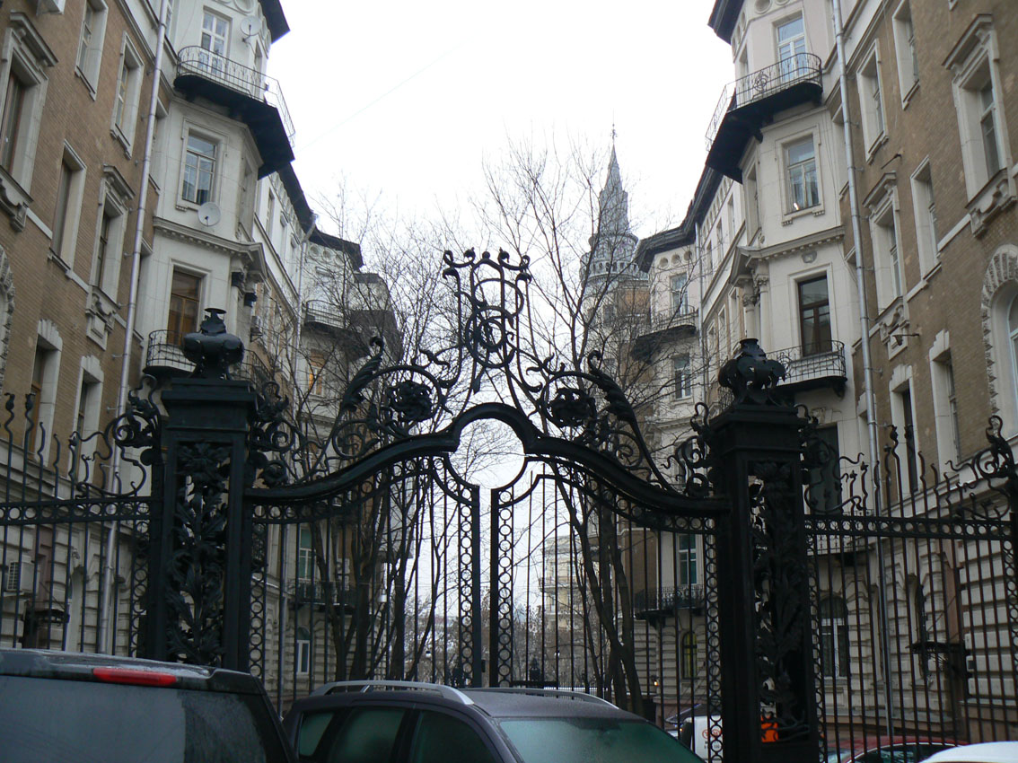 Это построенный в стиле модерн доходный дом страхового общества «Россия» на Сретенском бульваре (конец 19-го начало 20-го века). Особенно красив со стороны Тургеневской площади. Впечатляют кованые решётки, обрамляющие двор.