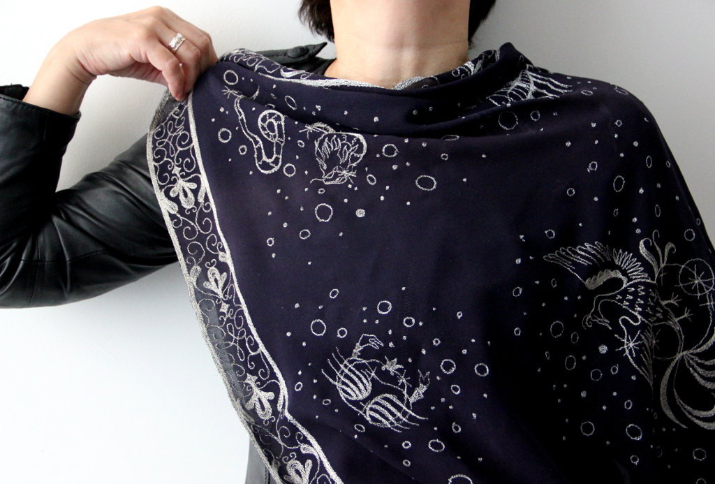 Шифоновый тёмно-синий платок "Созвездия" с вышивкой серебряными металлизированными нитками. "Готишный" такой. Размер 90x90 см.