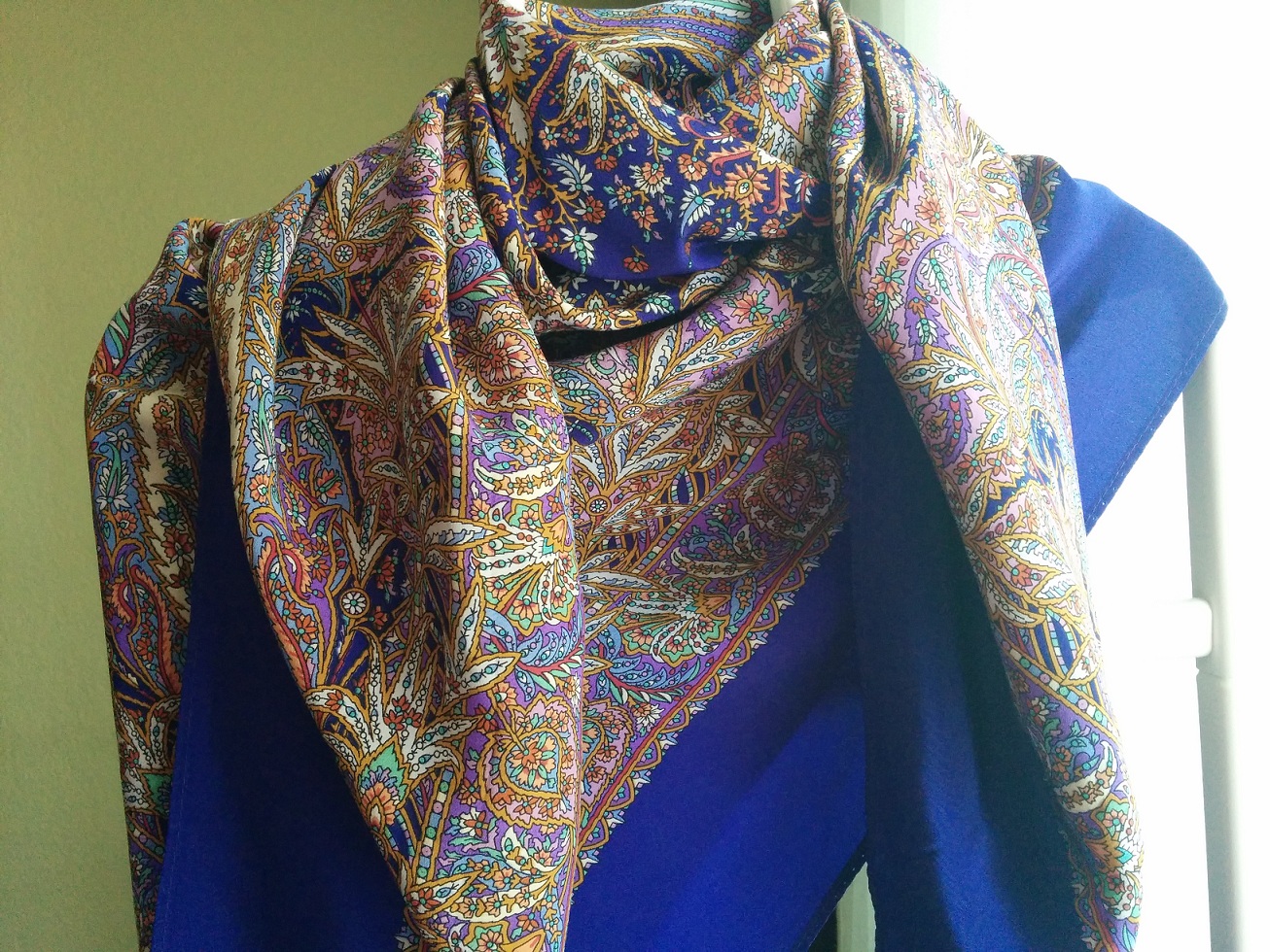 А у меня остался последний не-показанный и не-рассказанный платочек с моей поездки на Родину. Моя первая и наверное единственная шелковая шаль. Совершенно смущающий меня экземпляр. Во-первых нацелена я была на синепольные Сладости, встреча с которыми меня неприятно поразила - да, я попала на новый колорит, или на Берег Грез - очень нравится отдельно от себя и на Натасик. Не сложилось. Я была растеряна, как такое может быть - я же наконец-то здесь, в платочном царстве, где можно все пощупать и померить.