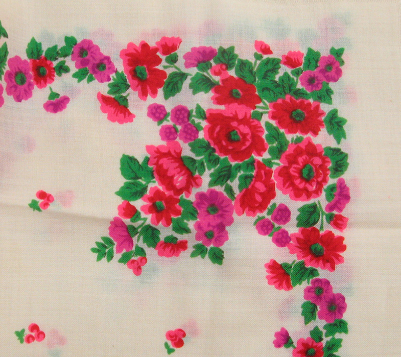 Все при нем: родамин, чистый синий и изумрудный цвета, отсутствие контура. У этого и всех остальных платков цвет фона теплый кремовый, экрю, чисто белые встречаются редко. Не знаю, такими ли они продавались, или потемнели от времени. Могу только сказать, что ношены эти платки не были.