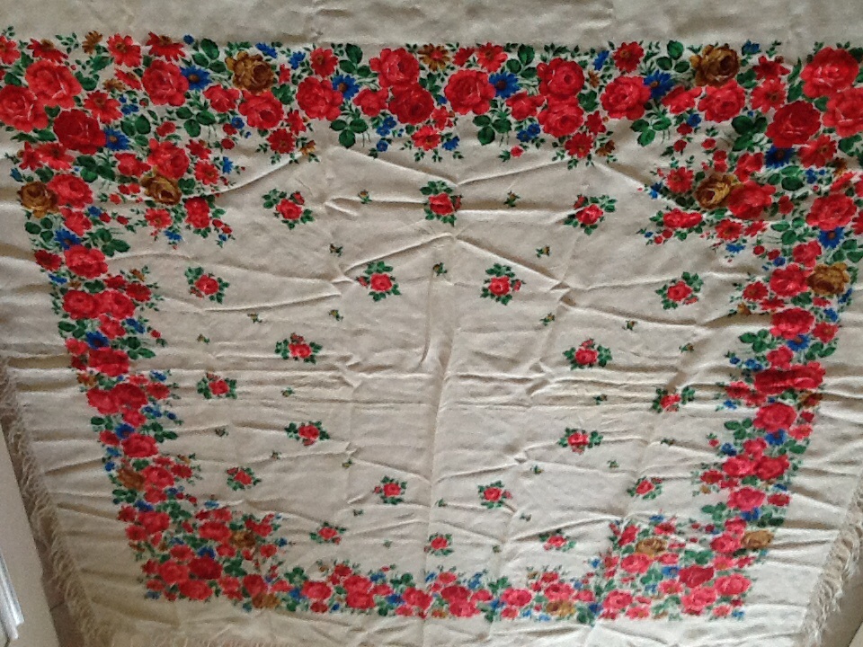Добрый день, шалезнатоки, вот еще один любимый платок хотелось бы опознать. Куплен в 80-е годы в России , в Сибири, привезли в подарок.За годы платок остался таким же красивым, стирали, а платок, как новый. /бахрома шерстяная/Платок все эти годы излучает свет и радость, тепло.