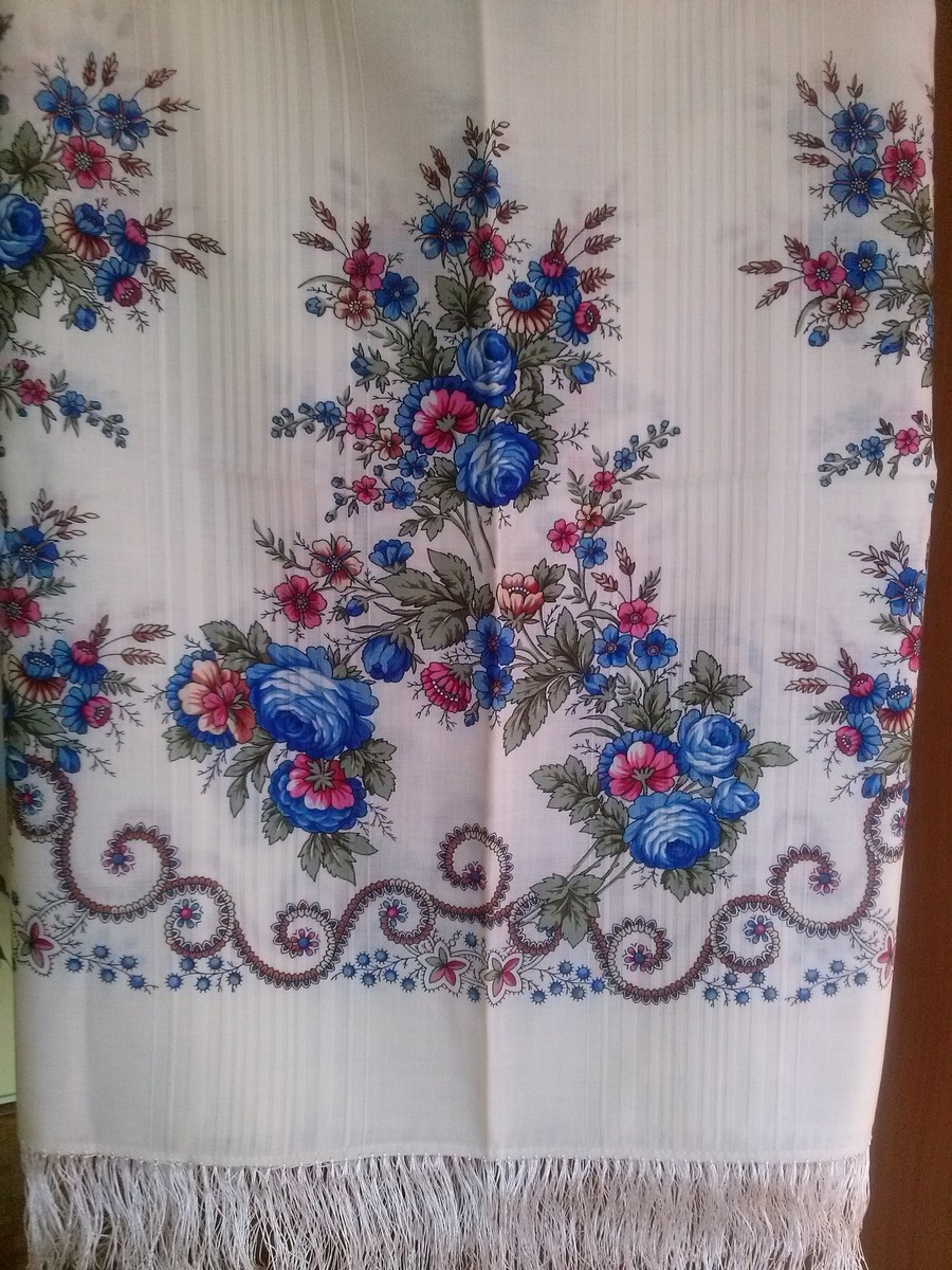 Платок покупался с пожеланием «синий минимализм на белом». Ткань мягкая, легко драпируется. Цветовая гамма = оригинал. По-моему, это нечастый случай, когда просновки как раз украшают платок (в силу его неперегруженности рисунком), играют свою собственную партию. Правда, пока раскладывала платочек для фото, сделала пару затяжек именно на просновочных местах.