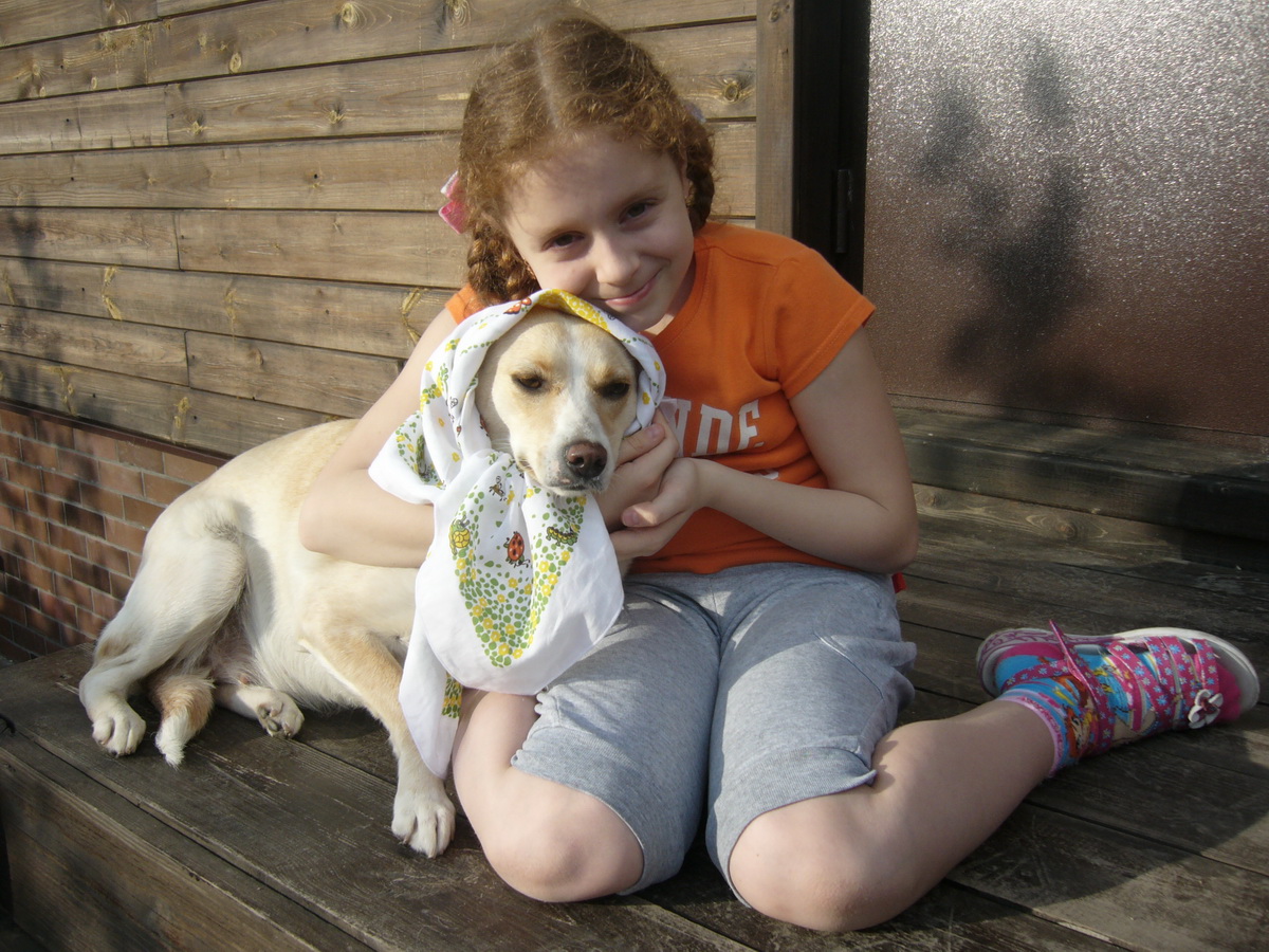 На фото она вместе с собачкой, которую хозяева зовут Лапочка или Шери (по-французски Дорогуша, а по-русски - производная от "Шериф", так как именно так звали ризеншнауцера, прожившего с ними 16 лет). Настя с ней подружилась. Лапочка трусовата слегка, но Настю терпит :) .