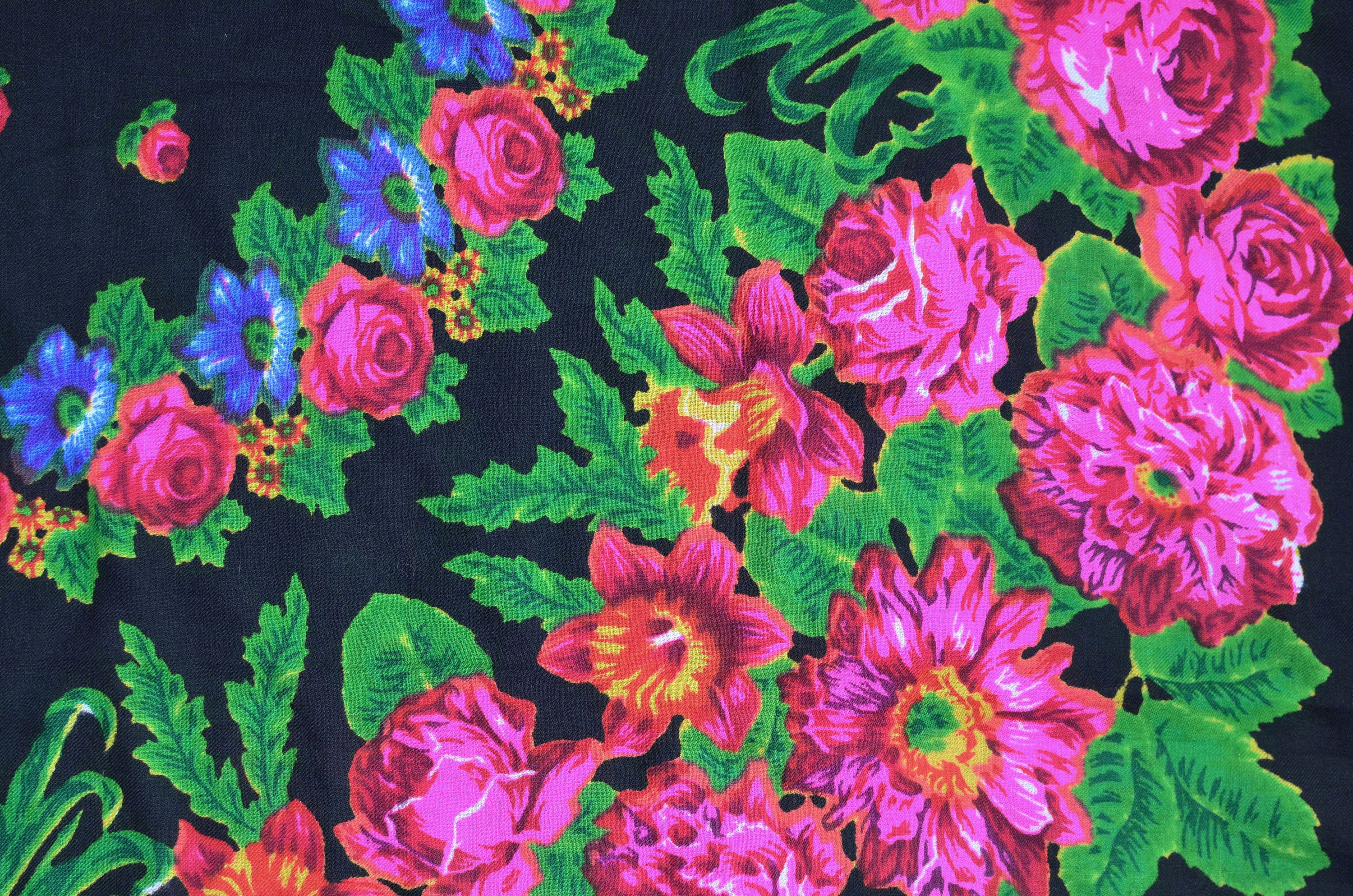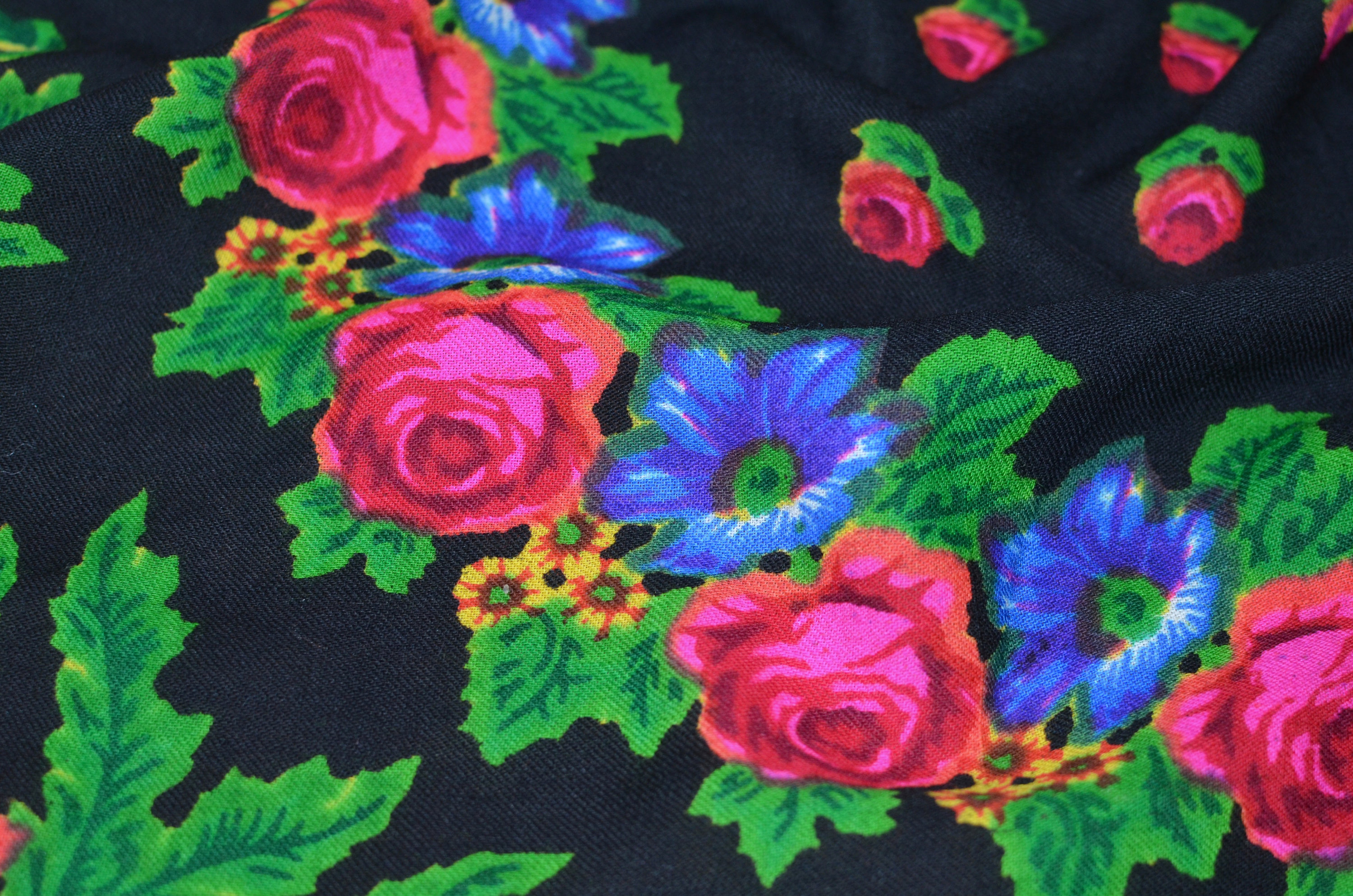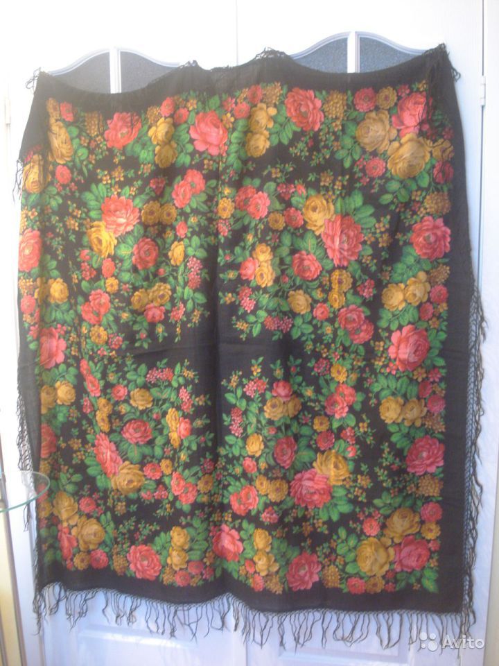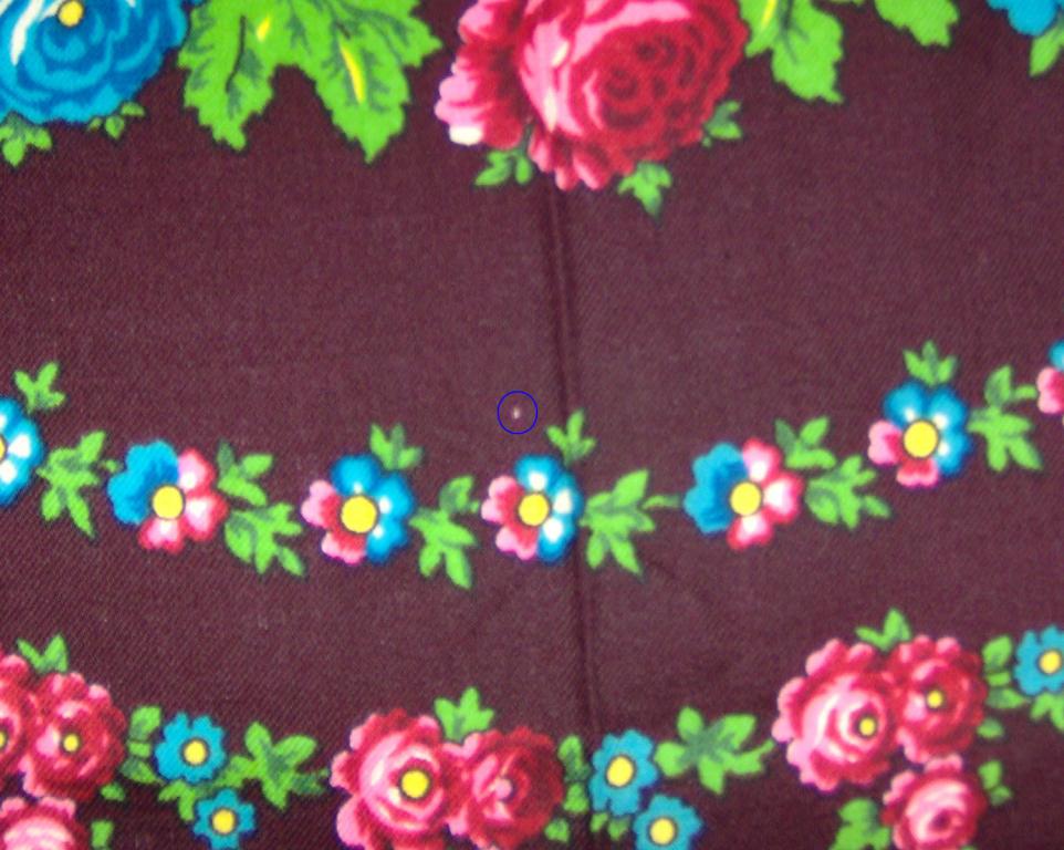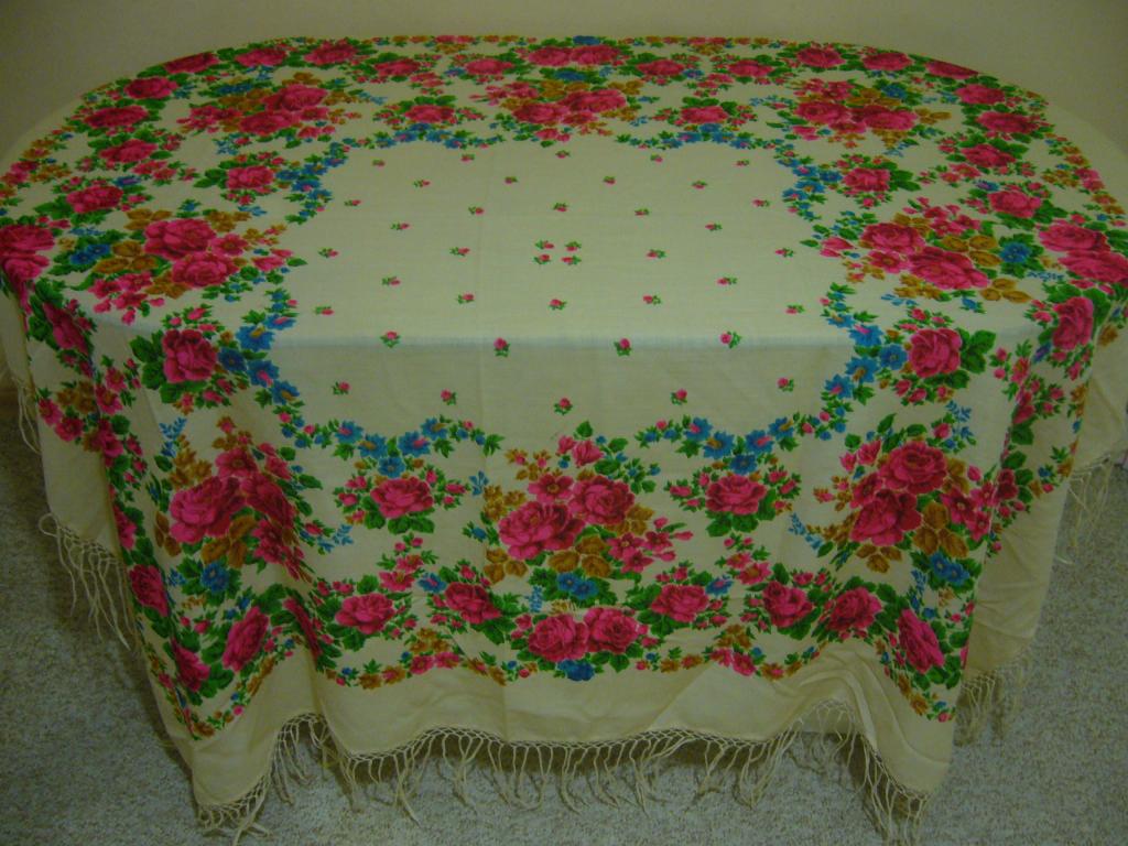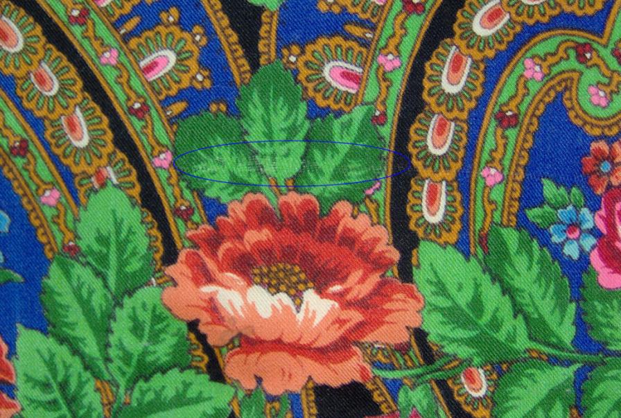 Шаль такую имею, но только на последней фотографии обратила внимание на лепестки мелких цветков- незабудок в гирлянде одного из кругов. Они раскрашены в разные цвета : голубой и розовый.