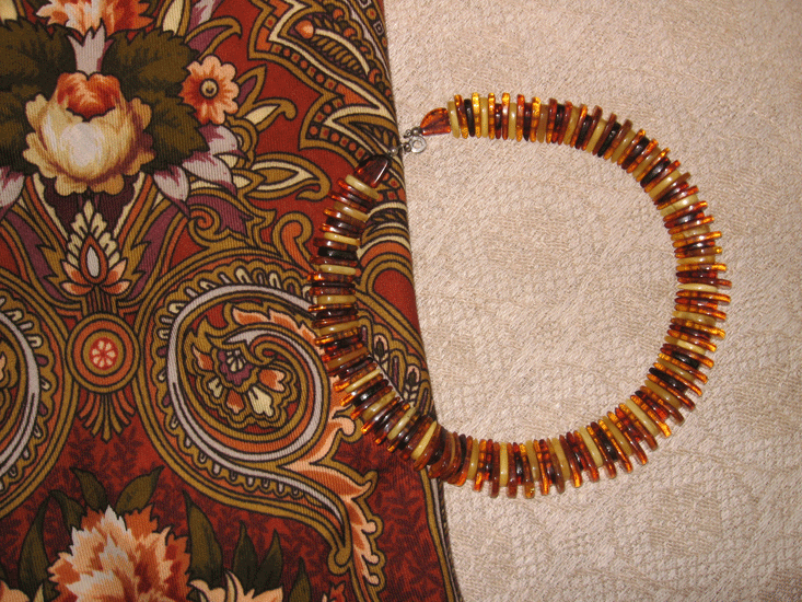 А вот к тому же "Сиянию" янтарное колье: мягче и по фактуре бусинок, и по колориту. Вызывало очень стойкий интерес у скандинавов. По-видимому потому, что там нет "своего" природного янтаря.