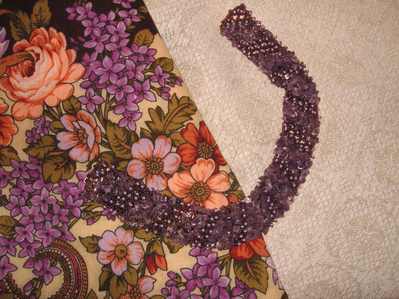 Аметистовый чокер (стойка). Плела моя подруга из аметистовых бусин-голышей и бисера. Я носила только на голой шее. Особенно чУдно смотрится с "Цветущей сиренью". Пользовался большим спросом у шведских дам: продать не просили, но интересовались - что это?, откуда? где купить?