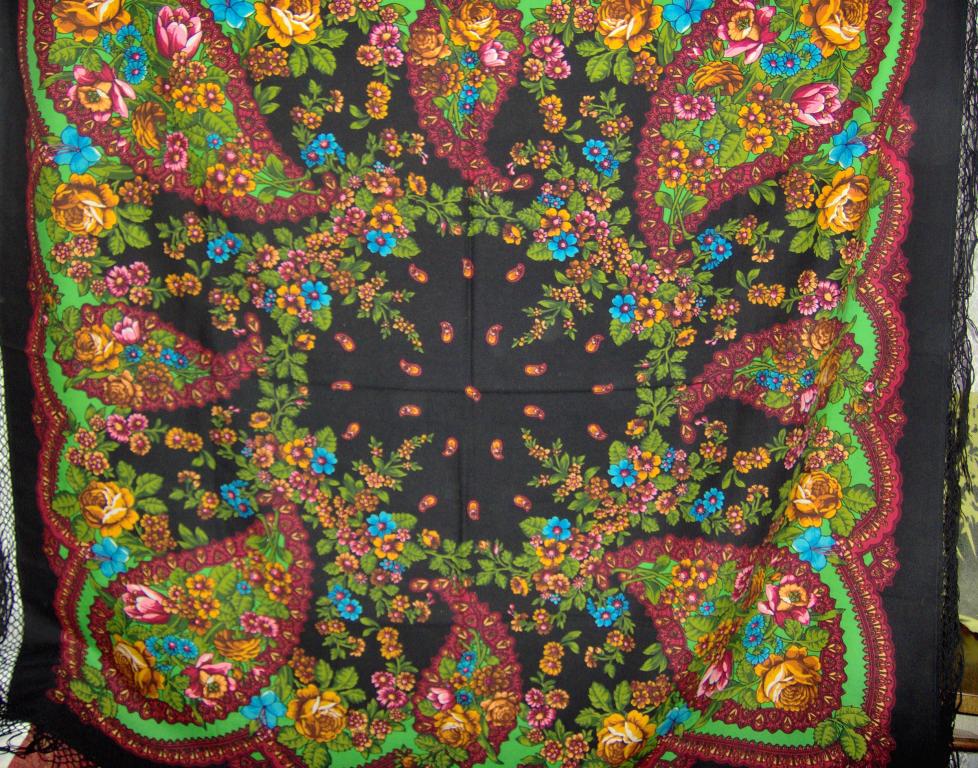 Шаль такую имею, но только на последней фотографии обратила внимание на лепестки мелких цветков- незабудок в гирлянде одного из кругов. Они раскрашены в разные цвета : голубой и розовый.