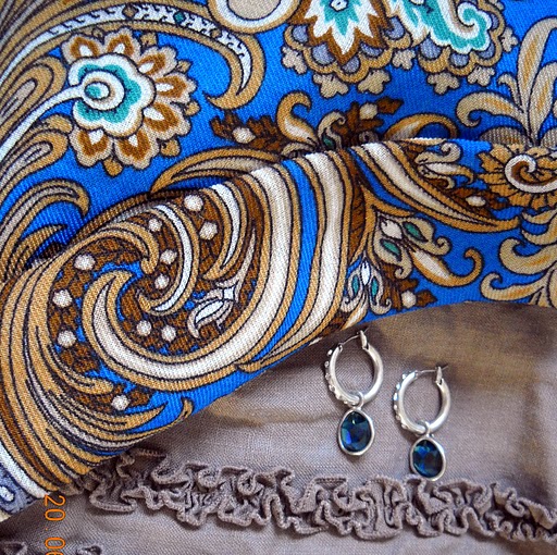 Платок хорошо сочетается с жемчугом. Думаю, что еще он будет прекрасно выглядеть с украшениями из чароита и малахита. Свой синий платок с украшениями покажу позже. (Кликните, чтобы почитать оффтопик)...