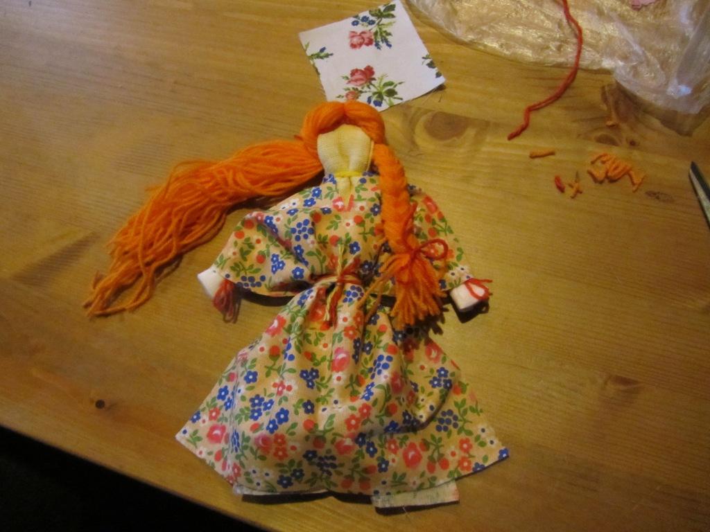 Кто-то просто собрал "волосы" в пучок, кто-то сделал одну косу. Я решила заплести две косички, и чтоб непременно они были не сзади, а спереди куколку украшали бы: