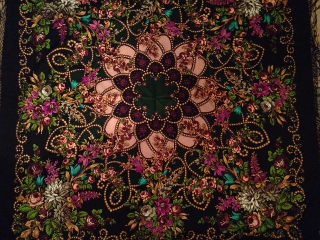 Серьезно: подумываю сложить два платка изнанками и сшить по краю. Одну бахрому можно снять, наверное. Только еще не решила, какие лучше платки брать: с одним рисунком или с разными. Можно, вообще, разные цвета попробовать. Даёшь тепло при -50!