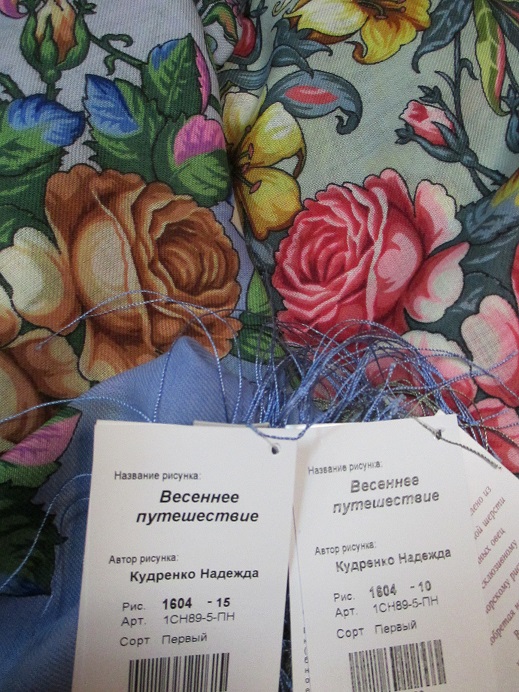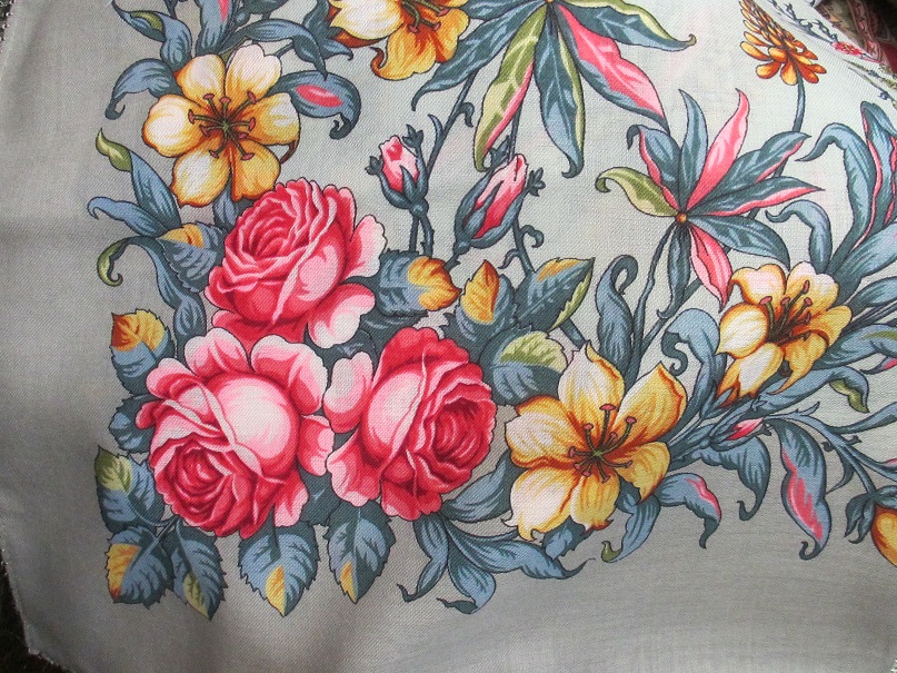89 на 89 с шёлковой бахромой. "Весеннее путешествие" ( здесь 2 колорита, в некоторых магазинах, говорят, замечены 4 ..). Весёлый, яркий, но ( на мой вкус ) - розы в углах композиции - спорно. Оттенок голубого - очень красив. Зеленовато-оливковый (-10) меняет цвет в зависимости от освещения сильно (!). Наиболее достоверен на "парных фото".