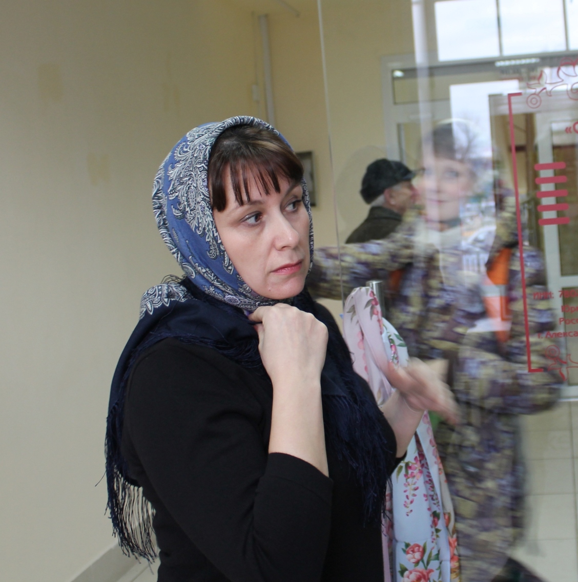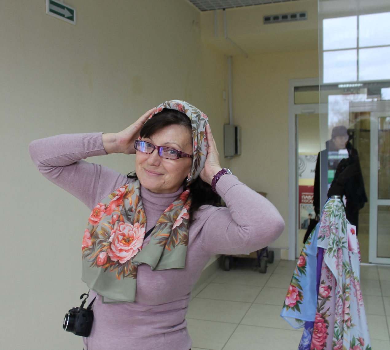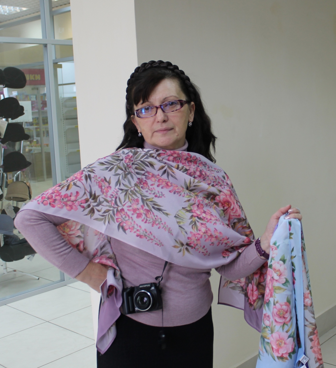 К нам в первый раз присоединилась Katrin M, Светлана , чему мы были очень рады! У Светланы была цель- подобрать платок к пуховику оливкового цвета. Светлане очень идут платки на голове.