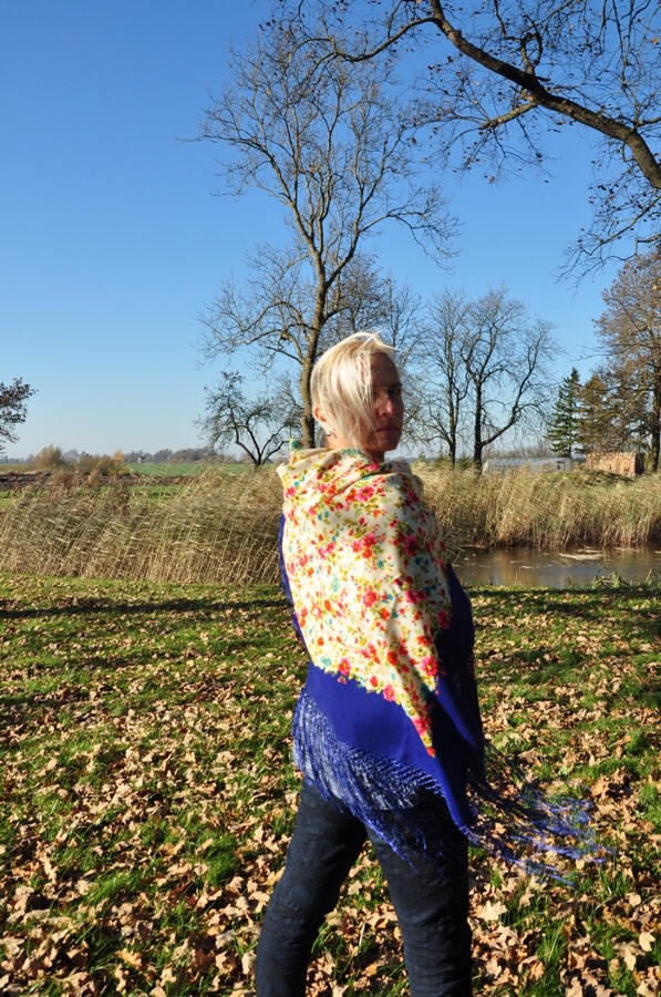 Ситцевый край я предпочла синего колорита, так как мне этот цвел нравится. Шаль мне легко удаётся сочетать со своей одеждой. Но она мне кажется больше подходит весной или летом.