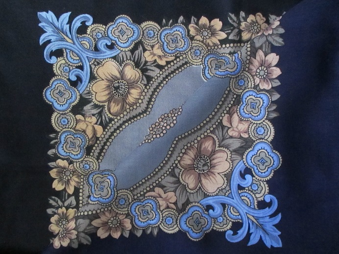 3. "Ностальгия" - одномоментно может встретиться в 3 вариантах. Очень тёмно-синяя (почти чёрная) кайма, кайма-сине-чернильного цвета, довольно яркая для этого платка, и тёмная кайма + светло-голубые цветы и узоры (голубой без "свечения") с очень красивой прорисовкой прожилок-оттенков.