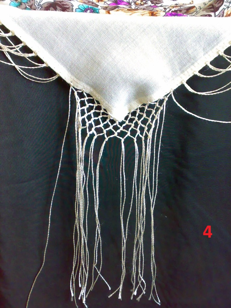 Если остаются проколы от старой бахромы (фото 2), то ничего страшного, на шерстяном платке или шали, после глажки их не будет видно. Когда нанизываю пряди на бахрому, то проколы делаю соответственно со стороны разметки, с изнанки. Прокалываю крючком толщиной 0,50 мм. Узелки вяжу тоже с помощью крючка, завязала руками узелок и обратной стороной крючка подтягиваю узел вверх (фото 5,6). Главное, хорошо завязать первый ряд . Следите, что бы не стягивался край. Узелки должны провисать, был вершиной треугольника.