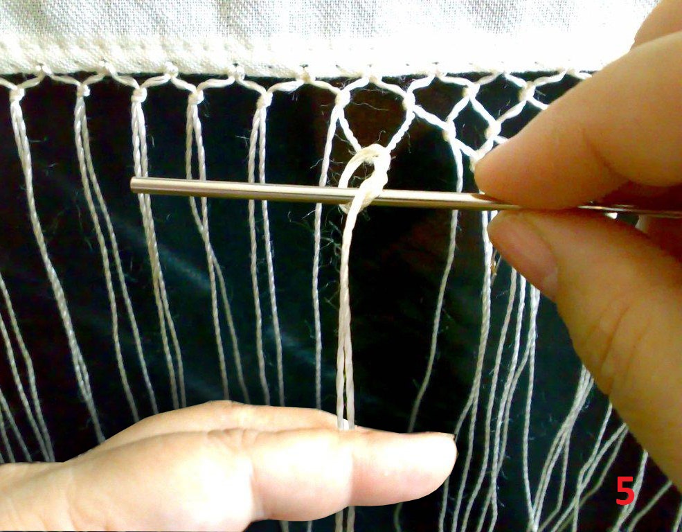 Если остаются проколы от старой бахромы (фото 2), то ничего страшного, на шерстяном платке или шали, после глажки их не будет видно. Когда нанизываю пряди на бахрому, то проколы делаю соответственно со стороны разметки, с изнанки. Прокалываю крючком толщиной 0,50 мм. Узелки вяжу тоже с помощью крючка, завязала руками узелок и обратной стороной крючка подтягиваю узел вверх (фото 5,6). Главное, хорошо завязать первый ряд . Следите, что бы не стягивался край. Узелки должны провисать, был вершиной треугольника.
