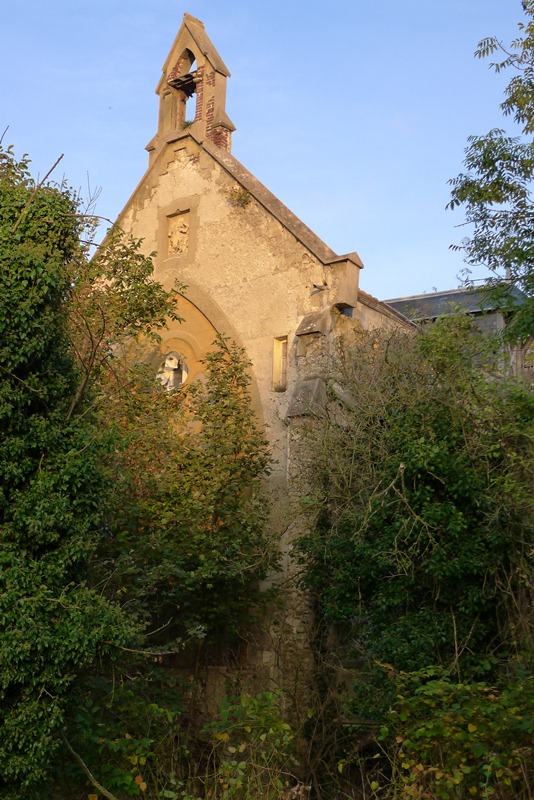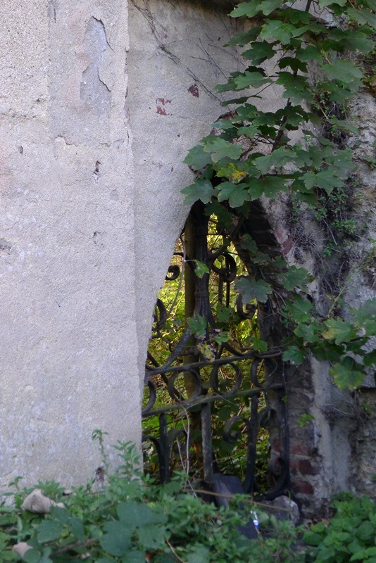 Возвращаемся, выходим из ворот, огибаем круглую привратную башню, идем снаружи вдоль стены. Башенки, и круглая, и квадратная, в неприглядном виде. Оконца выбиты либо заколочены, черепица крыш провалилась… Буйные заросли совсем поглотили и стену, и фронтон замка.