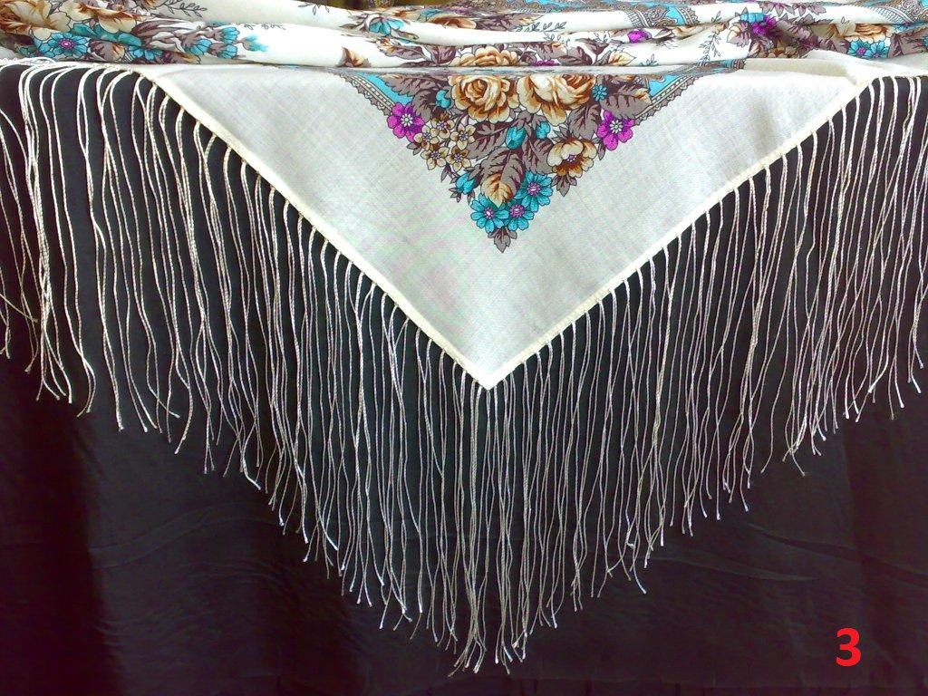 Мне нравится, когда бахрома совпадает по цвету с каймой, а не с рисунком платка. Но это дело вкуса.