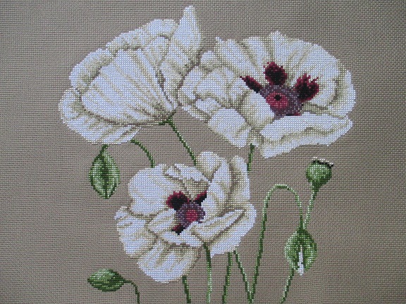 "Белые маки. Трио" завершила, наконец. Спокойненько получилось. Чёрный бисер в центр цветка буду нашивать перед оформлением работы в рамку.