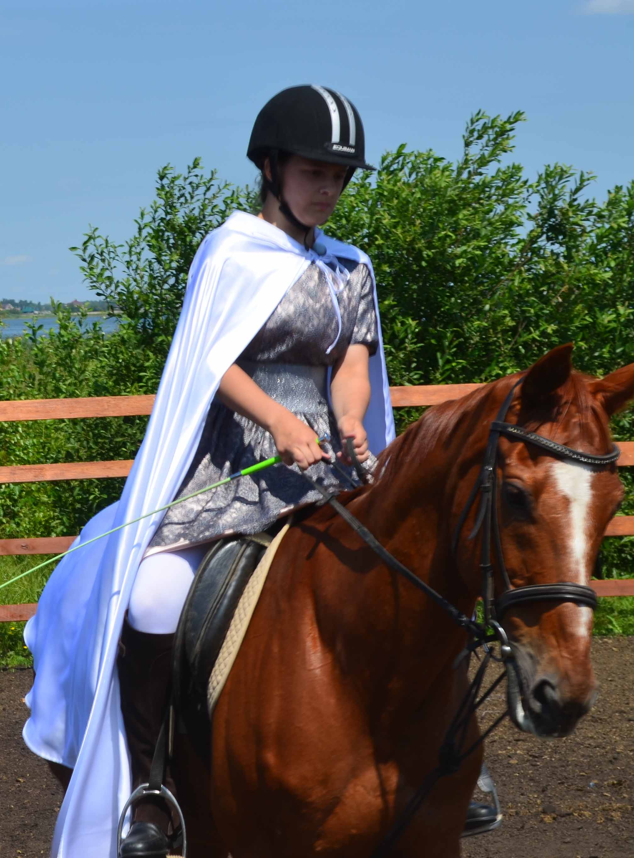 Покажу еще фото с летнего соревнования по выездке, надо было быть в костюмах, ребенок сообщила об этом очень вовремя, пришлось шить плащ в последние 2 ночи. Коня зовут Дэнс. Варя заняла 1 место.