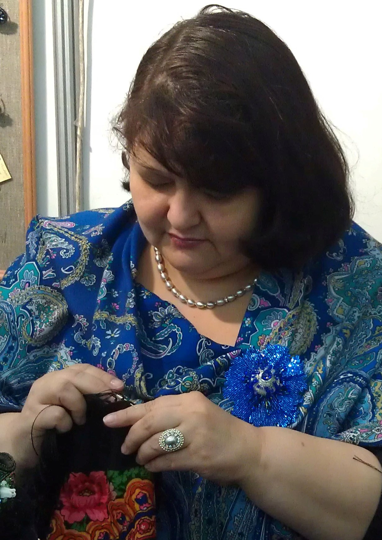 Этот комплект я ношу с Драгоценной 2, серой Чеканкой, синим Караваном, да серый жемчуг вообще ко многим шалям подходит.