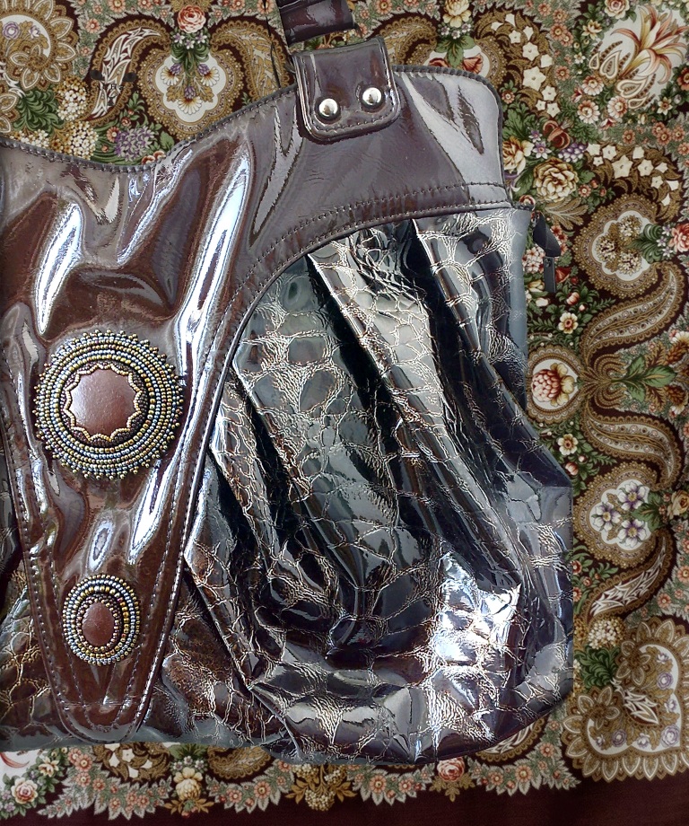 Когда начались всеобщие страдания по Губернаторскому 17, я тоже захотела эту шаль. И в это же время "разглядела" НСВ-17. Для меня самый красивый колорит НСВ (ну акромя 14 колорита конечно же). Пока ждала посылку с 17 НСВ, купила сумочку коричневую и решила украсить небольшой вышивкой. Обтянула пластиковый кабошон натуральной кожей и немного бисера. Получилось довольно таки интересно. Но.... когда я получила коричневый НСВ, то была до слез разочарована. Не мой цвет коричневый. Ну об этом писать не буду. Есть мои фото и в 17 НСВ и в 17 Губернаторском