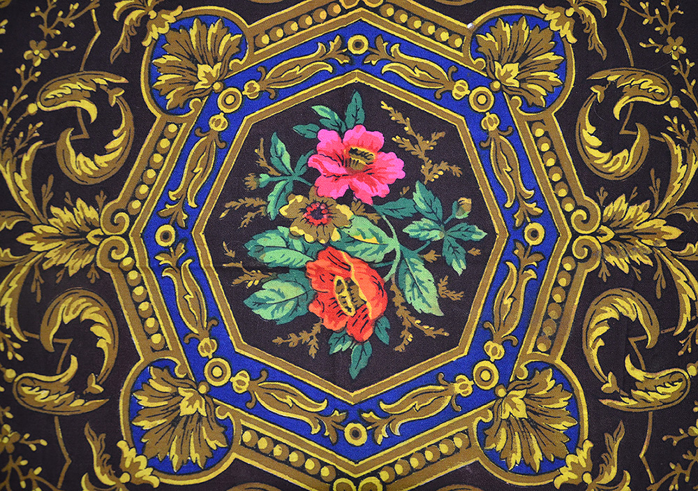 Ткань просвечивает, тонкая и немного ветхая. Рисунок темновато-тусклый.