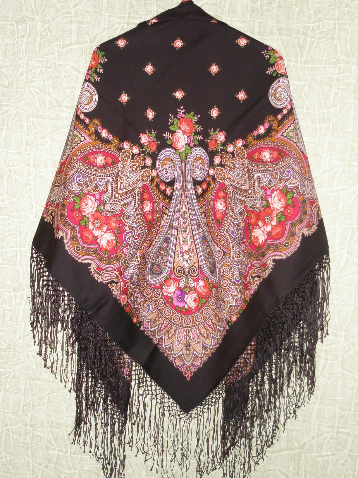 "Восточные напевы" 16-27 чёрная кайма размер 125-125 с шерст. бахромой рис.Клары Зиновьевой