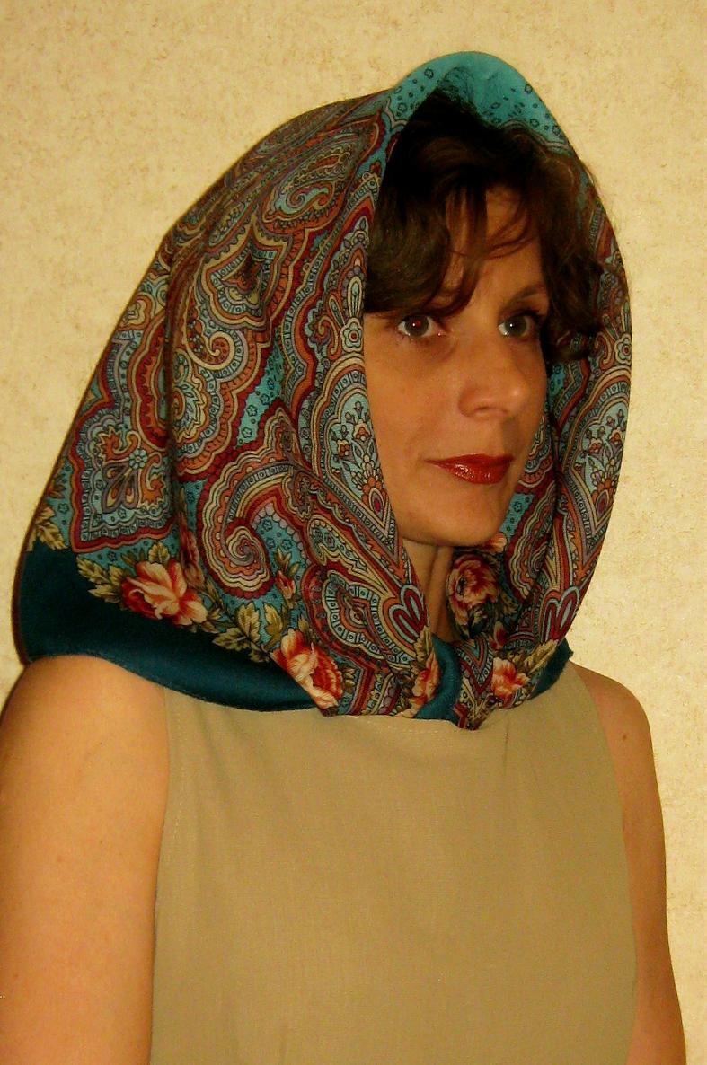 Фотографий кого-либо в нём я не нашла в Архиве и решила восполнить пробел. Платок очень интересный. И по цветовой гамме, и по тому, что с разнымы "намотками" видны либо только цветы, либо только орнамент, либо всё сразу. Всего будет более 10 фото. Начну с "головных" вариантов: