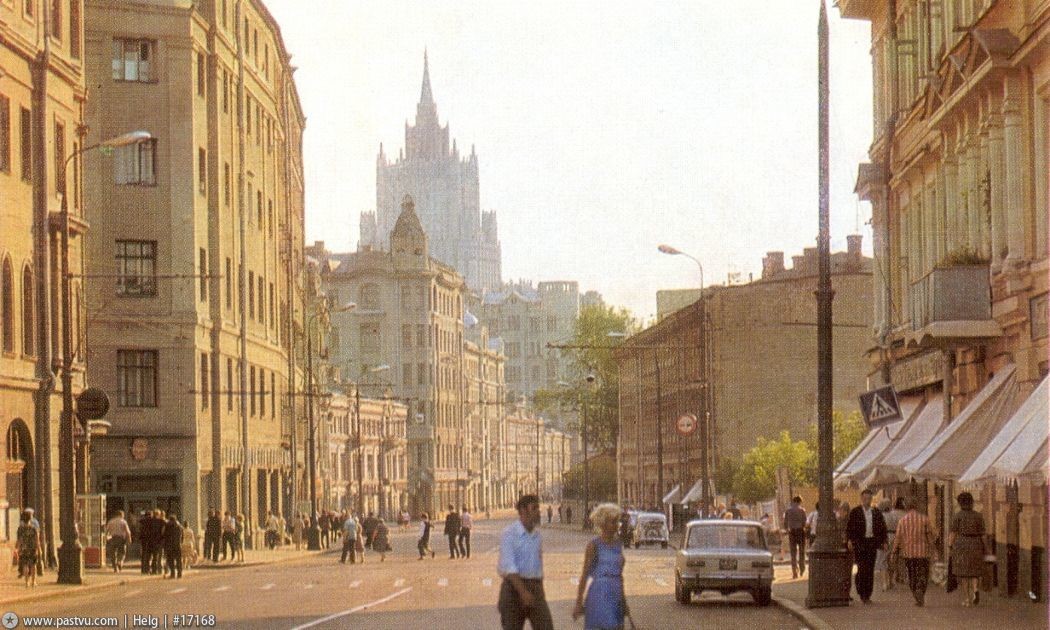 Арбат, еще не пешеходный в 1975 г 1974 строительство ТАСС А это сейчас, пока еще возможно