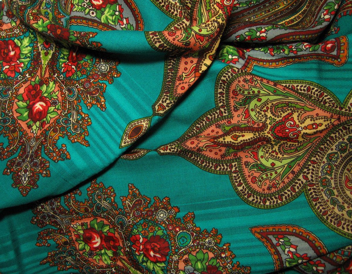 А в магазине в Кожевниках появилась бирюзовая Царевна-лягушка, о которой писал кто-то из питерцев пару недель назад. Яркий, но не кислотный платок, в намотке очень хорош. Цвет фона практически такой же, как на Княжеском-32, самую чуточку темнее.